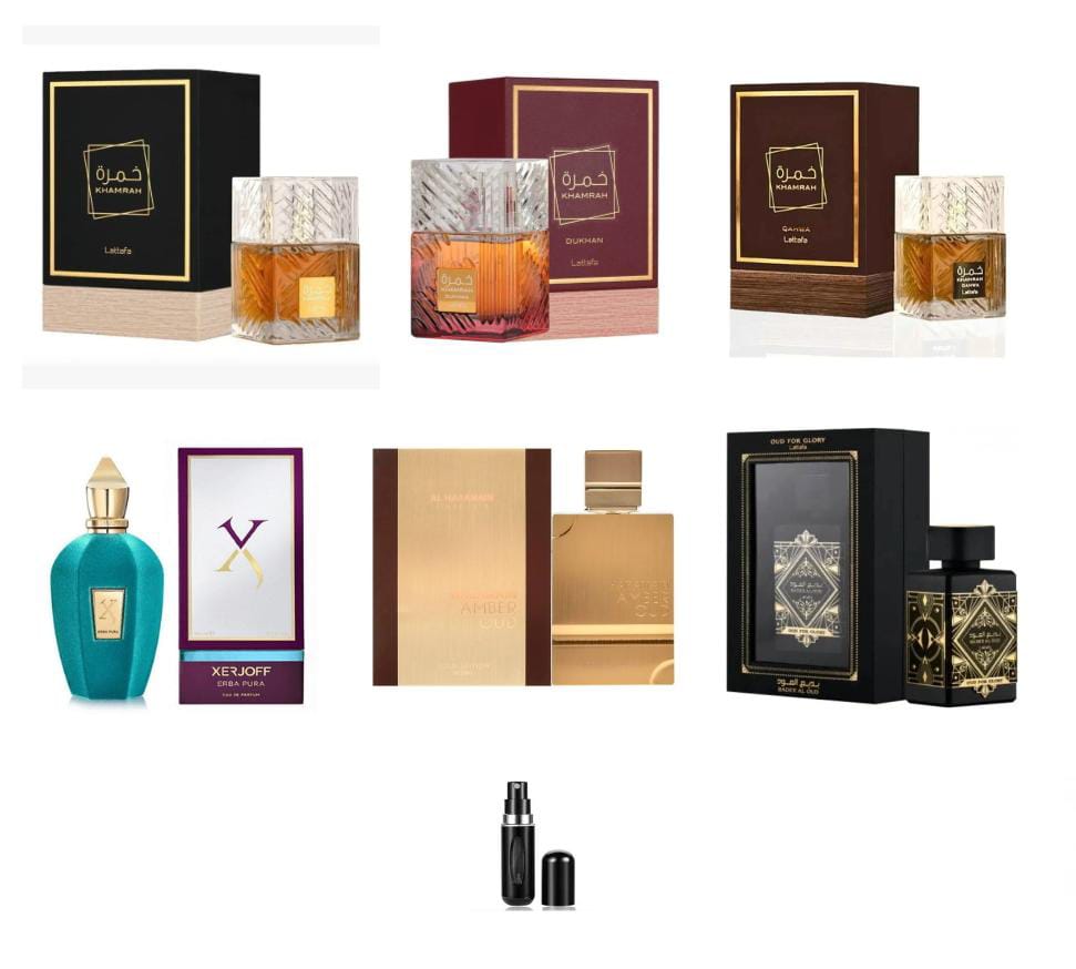 6 PERFUMES KHAMRAH, KHAMRAH QHAWA, KHAMRAH DUNKAN , ERBA PURA, AL HARAMAIN AMBER OUD GOLD, LATTAFA OUD FOR GLORY MAS 1 PERFUMERO RECARGABLE